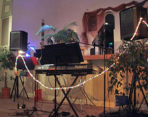 Mikrofonen selbstverständlich auch die Verstärkeranlage mit Mischpult und Lautsprechern.